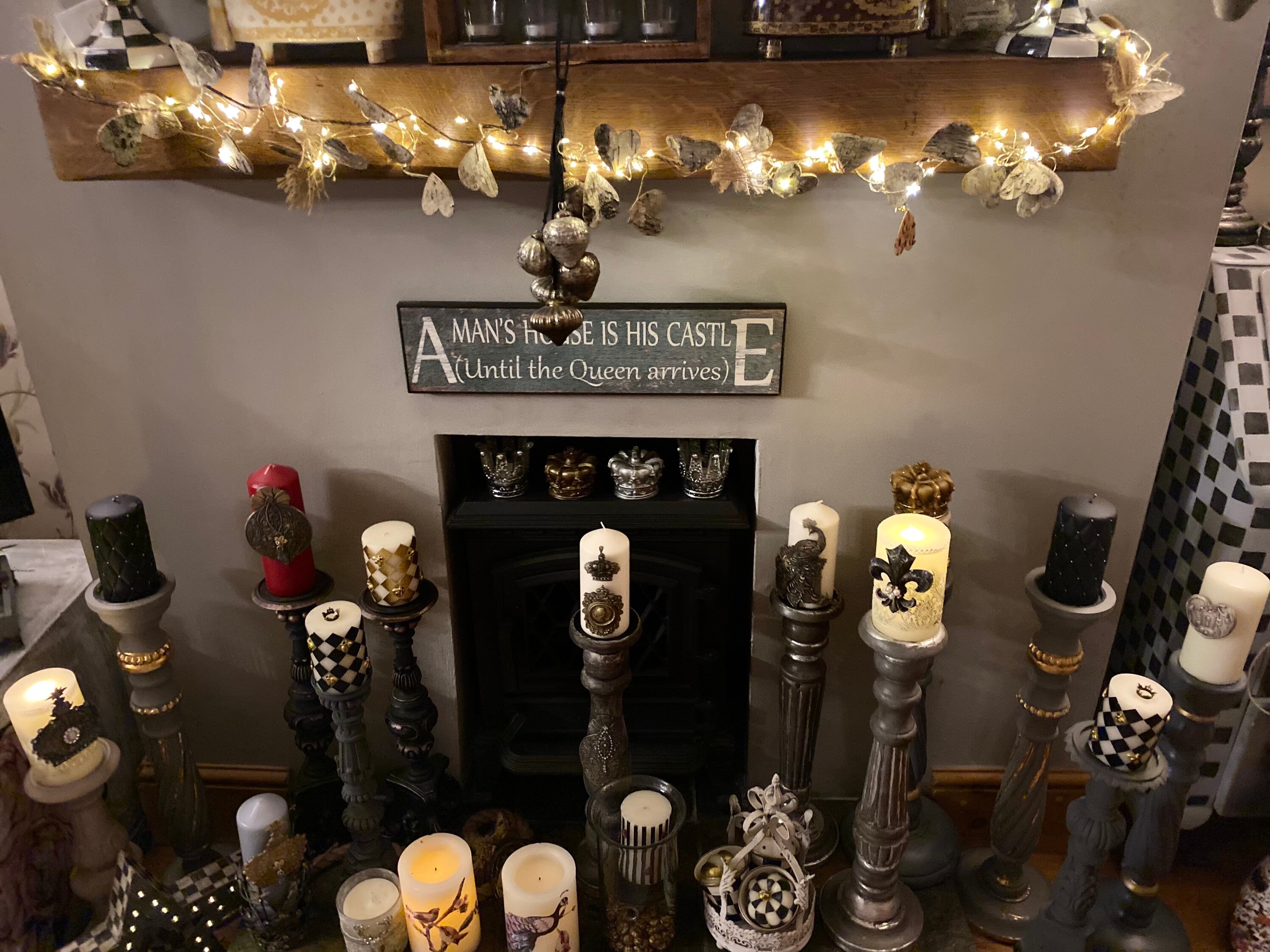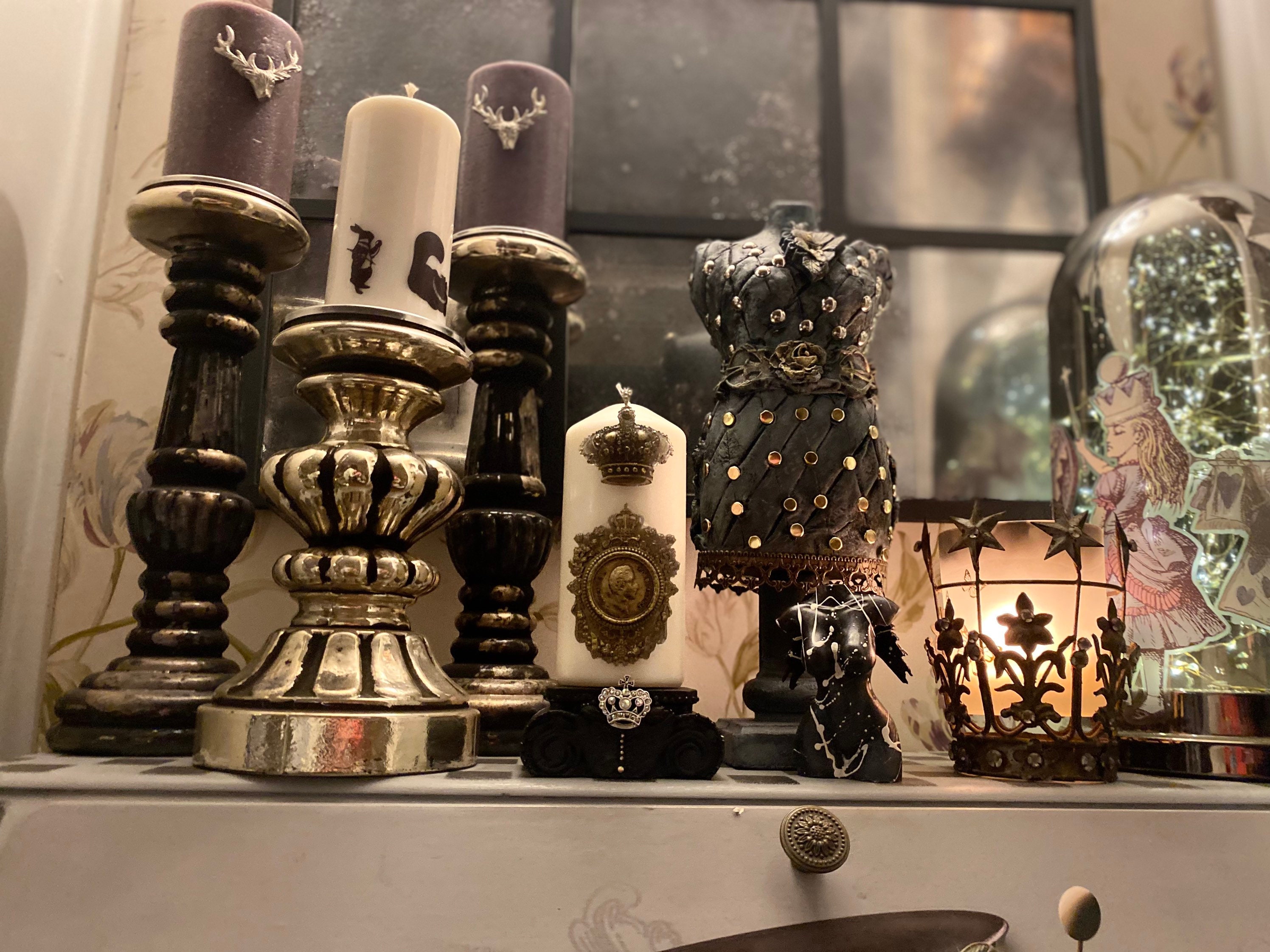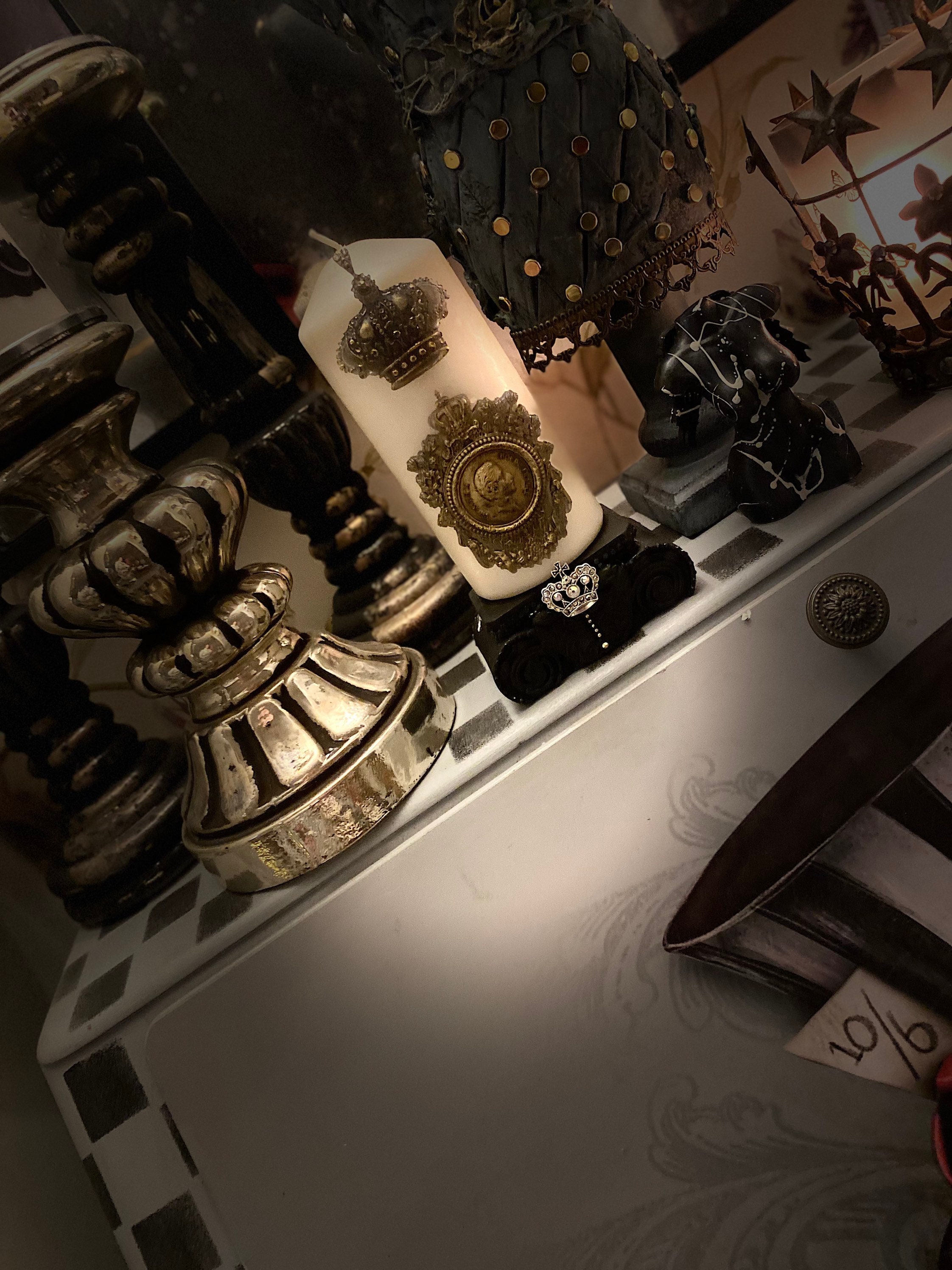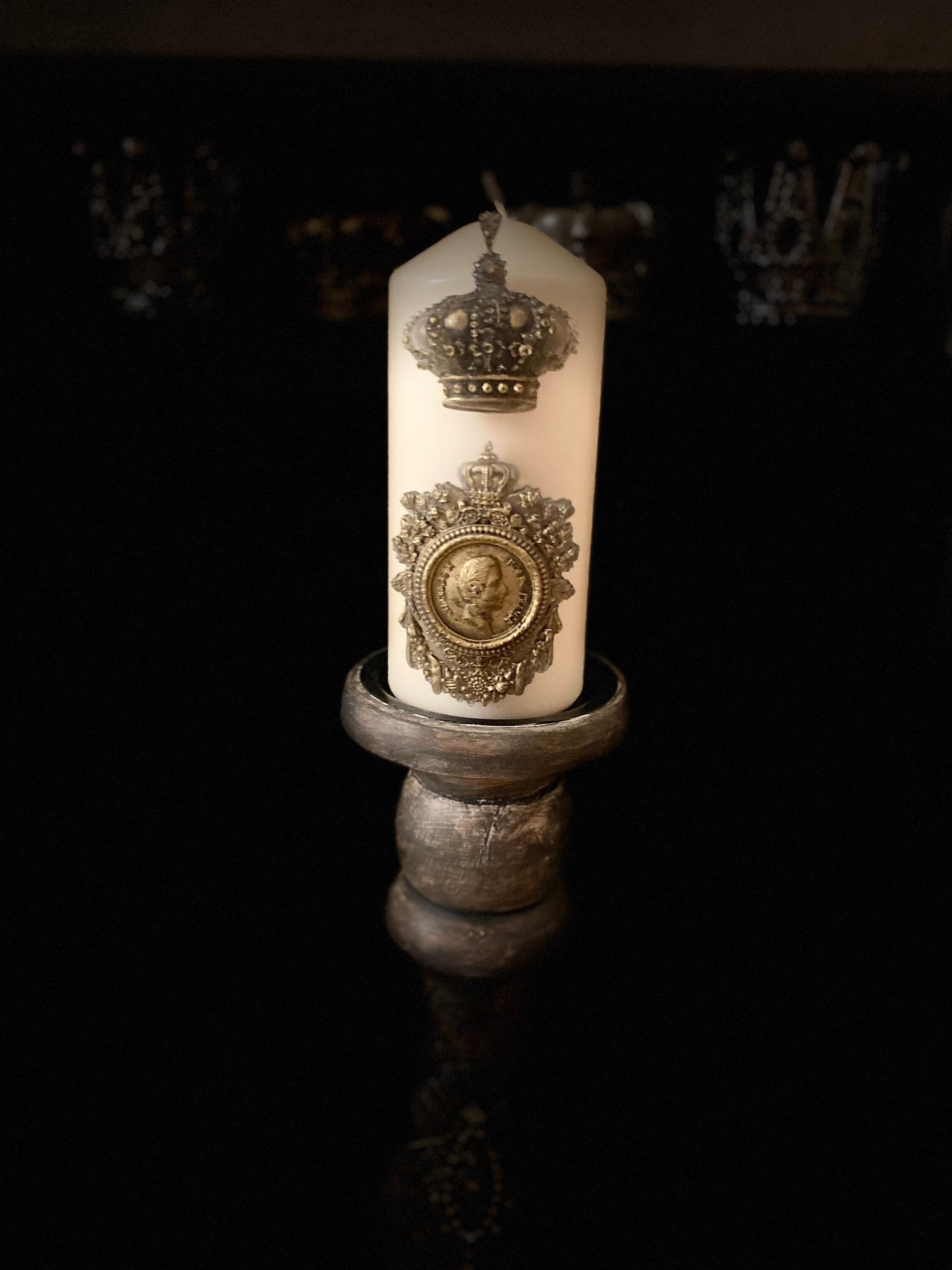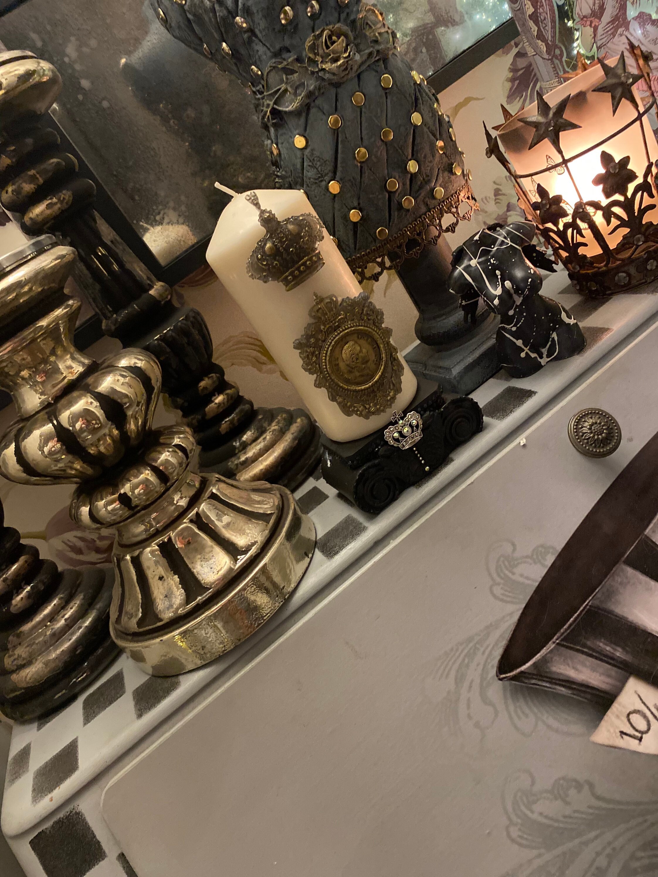 Handmade from resin this two Peice candlepins it painted in black with the gold wax finish mounted onto a ivory medium candle which is included.